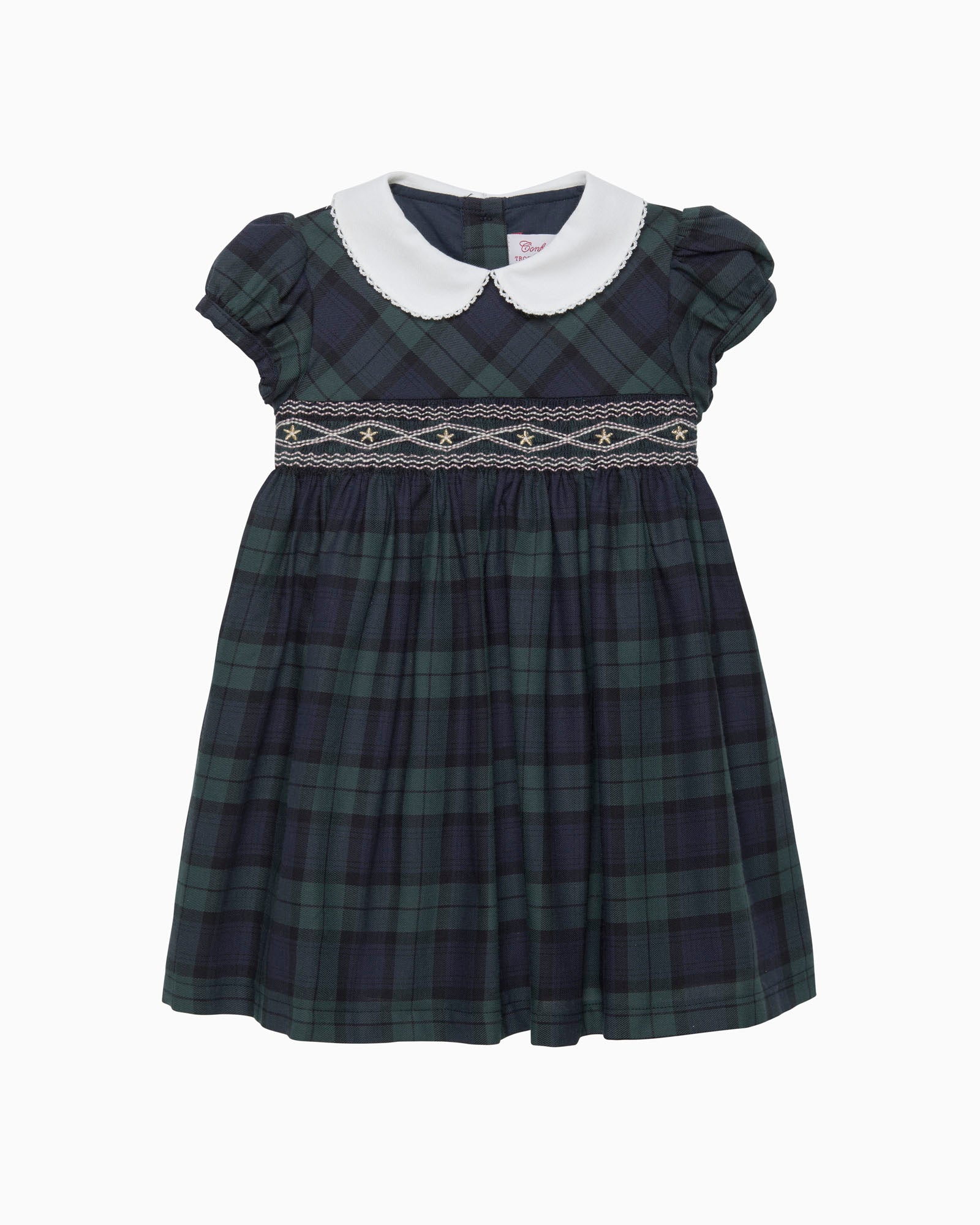 This traditional 100% cotton dress comes in a festive black watch tartan and features a delicate smocked panel on the front with complementary embroidery. Fully lined, it features a classic white Peter Pan collar and matching tie at the back for the perfect finish.