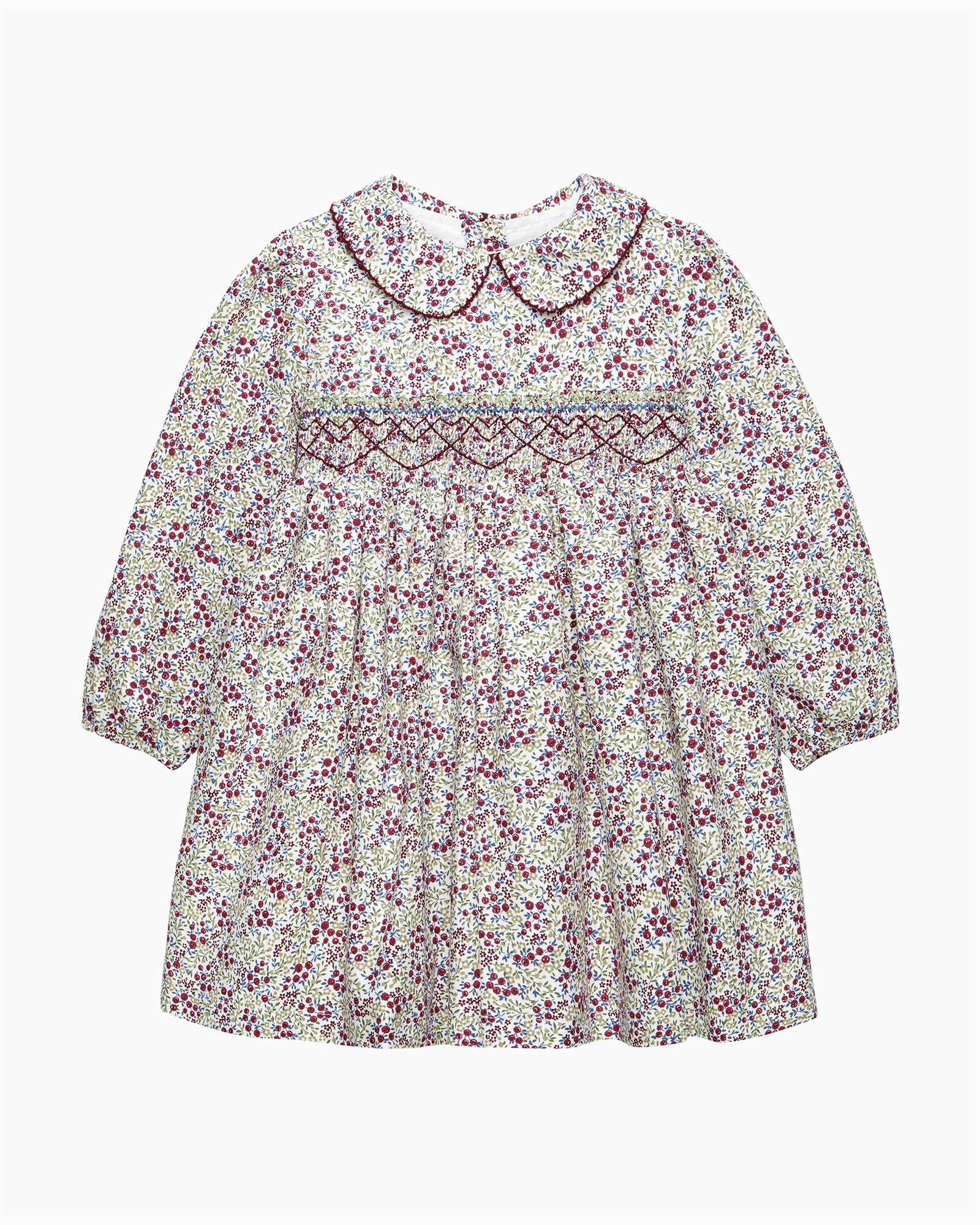 Our Edie dress comes in a beautiful all-over miniature floral print, in berry hues and features a smart smocked panel across the front, complete with complimentary embroidered detailing. Finished off with long sleeves and a delicate frill collar, this makes a great transitional piece as the weather starts to get fresher.