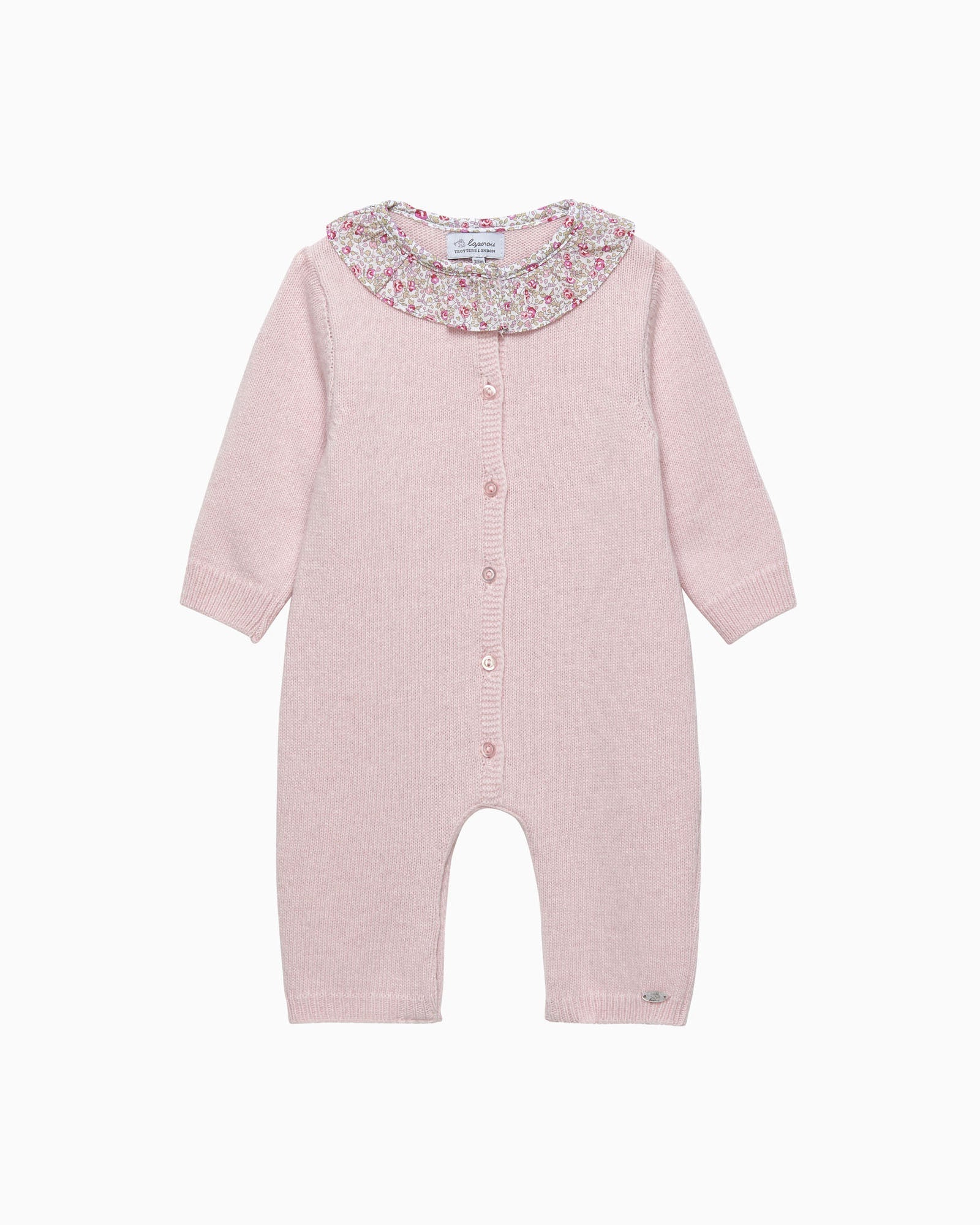 This wonderfully soft and warm cashmere mix knitted all-in-one features cosy long sleeves and a complementary willow collar in Liberty's Eloise print fabric, an archive design depicting small Victorian florals. Finished off with a button down front and popper fastenings along the inside leg seam, this makes the perfect outfit to snuggle your newborn up in this season.
