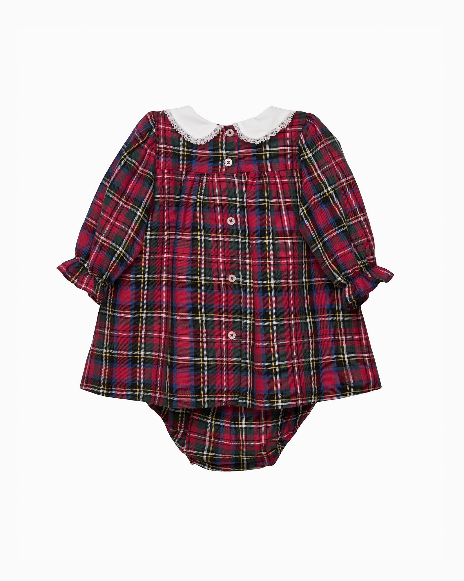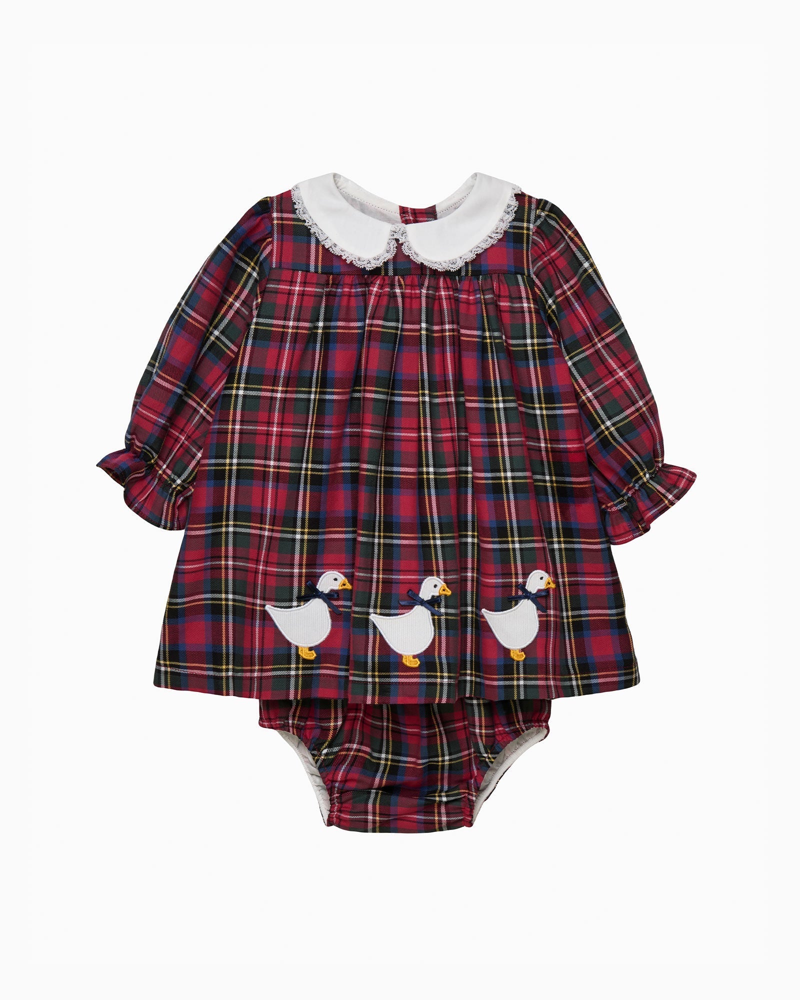 Made in festive red tartan, this baby tartan duck dress makes a beautiful gift and a wonderful keepsake for any new arrivals. It features long sleeves with elasticated cuffs, a classic Peter Pan collar with delicate lace trim and our signature appliqué ducks along the hem, complete with navy satin bow detailing. Fully cotton lined, it's sold with a pair of matching knickers for the ultimate baby girl outfit.