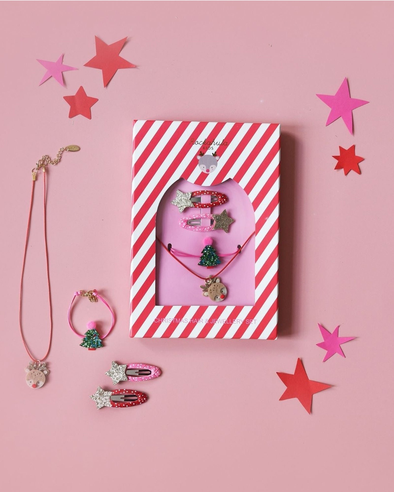 This lovely gift box makes the perfect Christmas gift! The set includes two gold glitter star clips, a reindeer necklace and a Christmas tree bracelet.