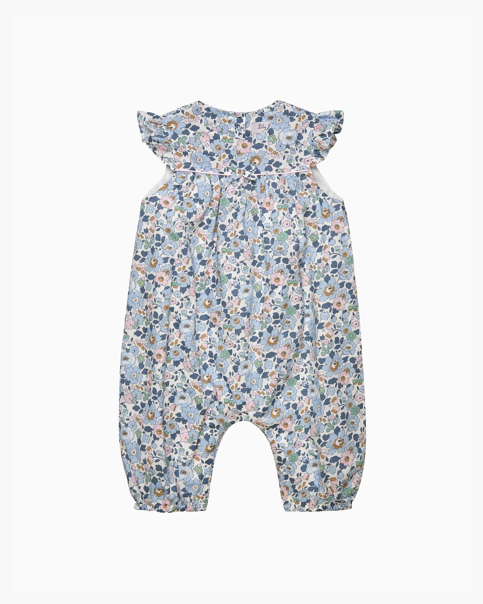 Made in Liberty's Betsy print fabric, an iconic stylised floral design that dates from the 30s, this romper for baby girls features delicate frill cap sleeves as well as a complementary blue grosgrain bow across the chest. The addition of elasticated ankle cuffs create a sweet silhouette while popper fastening allow for easy dressing and changing.